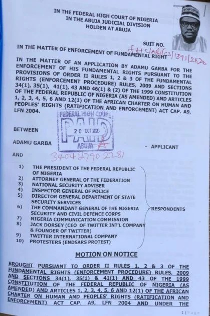 #EndSARS: APC chieftain Adamu Sues Twitter Founder, Jack at Abuja High Court, Asks for $1bn Fine