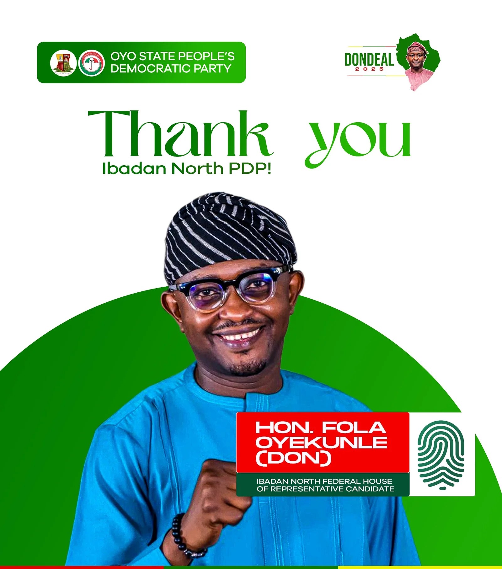 Hon. Folajimi Oyekunle, widely known as Don, has expressed profound gratitude following his emergence as the Peoples Democratic Party (PDP) candidate for the forthcoming bye-election in the Ibadan North Federal Constituency, scheduled for August 16, 2025.